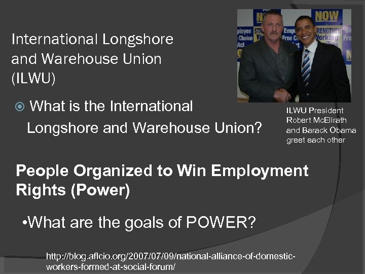 International Longshore and Warehouse Union (ILWU) What is the International Longshore and Warehouse Union? ILWU President Robert Mc. Ellrath and Barack Obama greet each other People Organized to Win Employment Rights (Power) • What are the goals of POWER? http: //blog. aflcio. org/2007/07/09/national-alliance-of-domesticworkers-formed-at-social-forum/