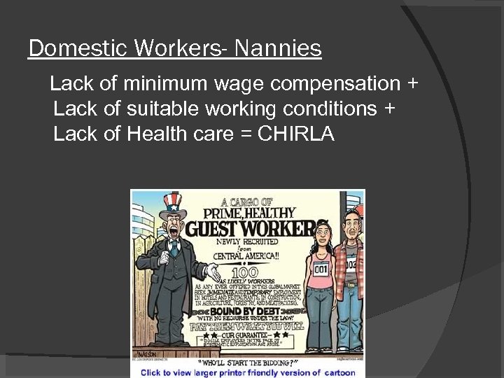 Domestic Workers- Nannies Lack of minimum wage compensation + Lack of suitable working conditions + Lack of Health care = CHIRLA