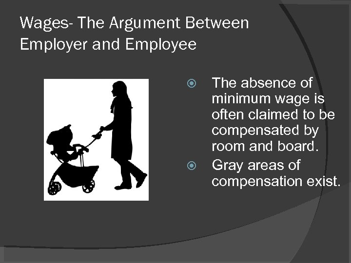 Wages- The Argument Between Employer and Employee The absence of minimum wage is often claimed to be compensated by room and board. Gray areas of compensation exist.