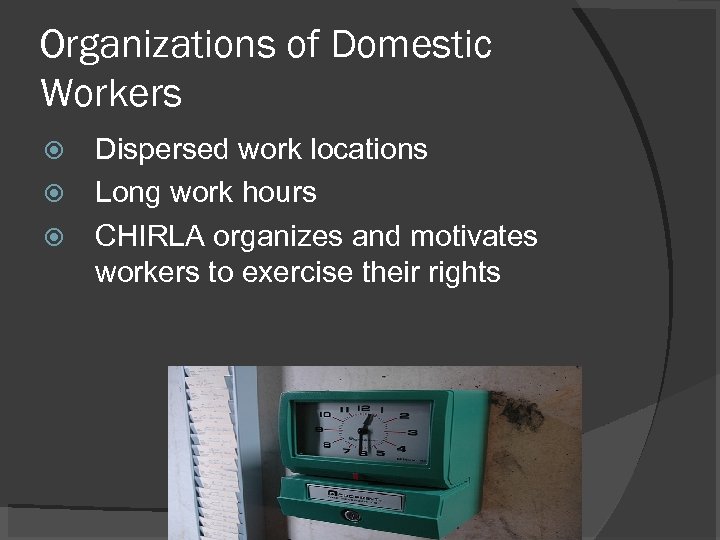 Organizations of Domestic Workers Dispersed work locations Long work hours CHIRLA organizes and motivates workers to exercise their rights