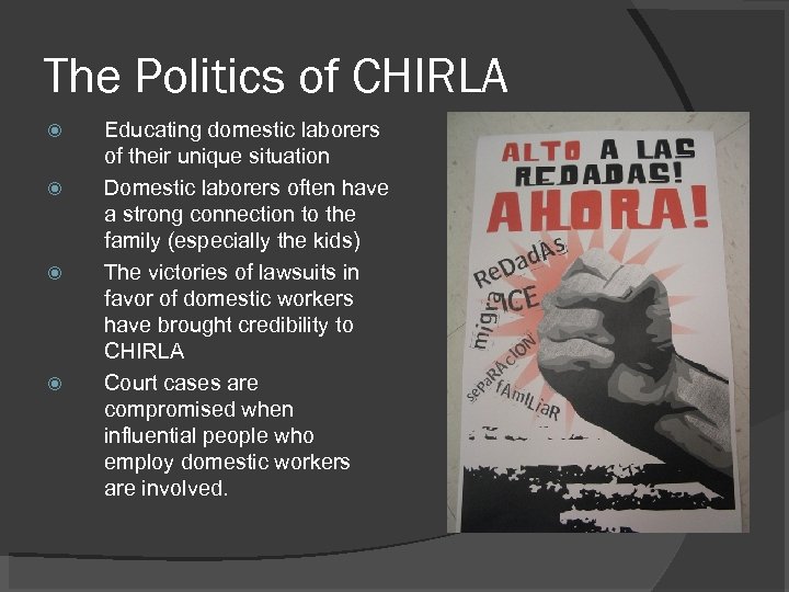 The Politics of CHIRLA Educating domestic laborers of their unique situation Domestic laborers often have a strong connection to the family (especially the kids) The victories of lawsuits in favor of domestic workers have brought credibility to CHIRLA Court cases are compromised when influential people who employ domestic workers are involved.