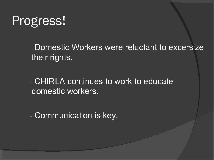 Progress! - Domestic Workers were reluctant to excersize their rights. - CHIRLA continues to work to educate domestic workers. - Communication is key.