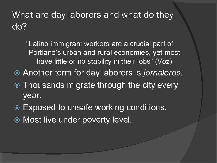 What are day laborers and what do they do? “Latino immigrant workers are a crucial part of Portland’s urban and rural economies, yet most have little or no stability in their jobs” (Voz). Another term for day laborers is jornaleros. Thousands migrate through the city every year. Exposed to unsafe working conditions. Most live under poverty level.