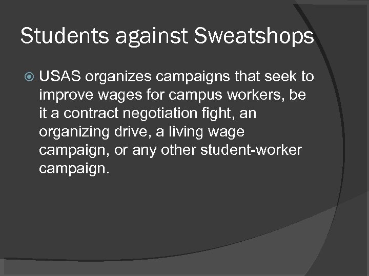 Students against Sweatshops USAS organizes campaigns that seek to improve wages for campus workers, be it a contract negotiation fight, an organizing drive, a living wage campaign, or any other student-worker campaign.