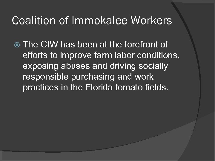 Coalition of Immokalee Workers The CIW has been at the forefront of efforts to improve farm labor conditions, exposing abuses and driving socially responsible purchasing and work practices in the Florida tomato fields.