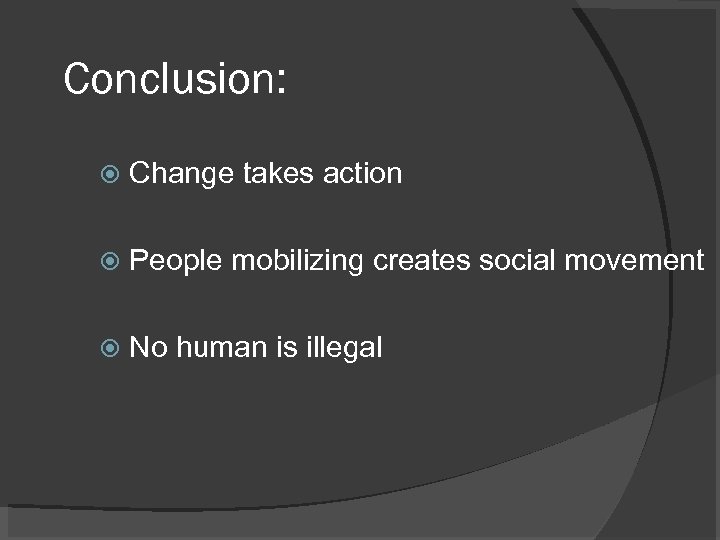 Conclusion: Change takes action People mobilizing creates social movement No human is illegal
