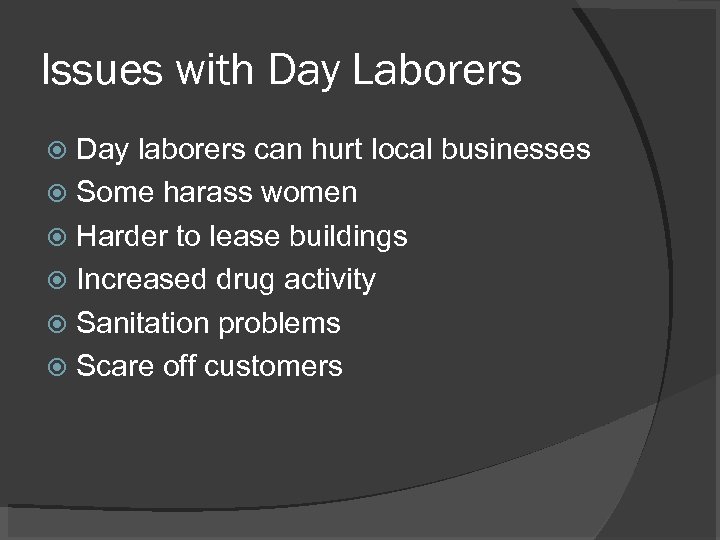 Issues with Day Laborers Day laborers can hurt local businesses Some harass women Harder to lease buildings Increased drug activity Sanitation problems Scare off customers