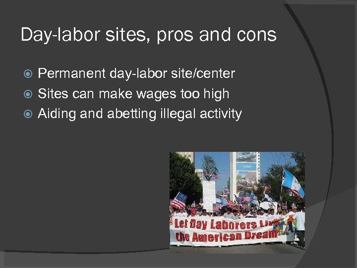 Day-labor sites, pros and cons Permanent day-labor site/center Sites can make wages too high Aiding and abetting illegal activity