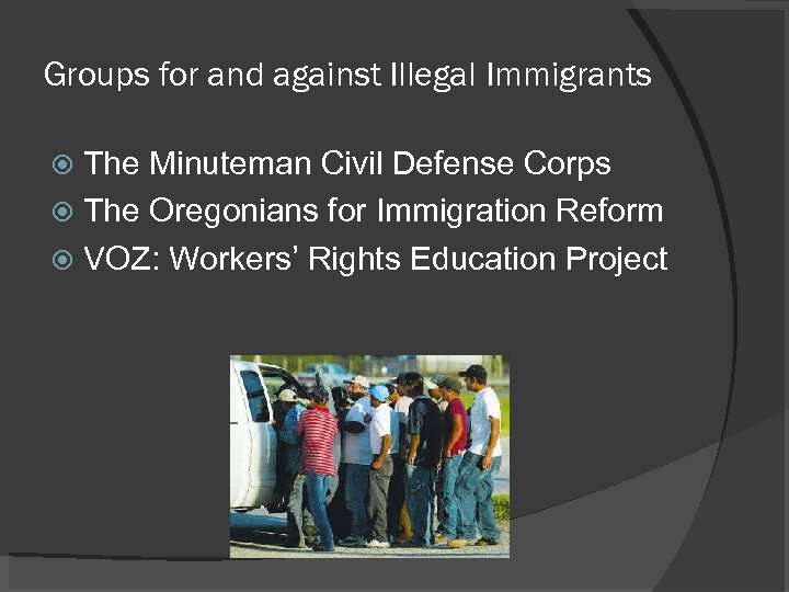 Groups for and against Illegal Immigrants The Minuteman Civil Defense Corps The Oregonians for Immigration Reform VOZ: Workers’ Rights Education Project