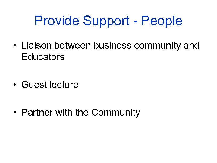 Provide Support - People • Liaison between business community and Educators • Guest lecture • Partner with the Community