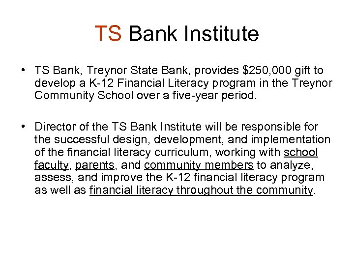 TS Bank Institute • TS Bank, Treynor State Bank, provides $250, 000 gift to develop a K-12 Financial Literacy program in the Treynor Community School over a five-year period. • Director of the TS Bank Institute will be responsible for the successful design, development, and implementation of the financial literacy curriculum, working with school faculty, parents, and community members to analyze, assess, and improve the K-12 financial literacy program as well as financial literacy throughout the community.
