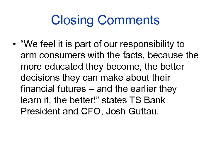 Closing Comments • “We feel it is part of our responsibility to arm consumers with the facts, because the more educated they become, the better decisions they can make about their financial futures – and the earlier they learn it, the better!” states TS Bank President and CFO, Josh Guttau.