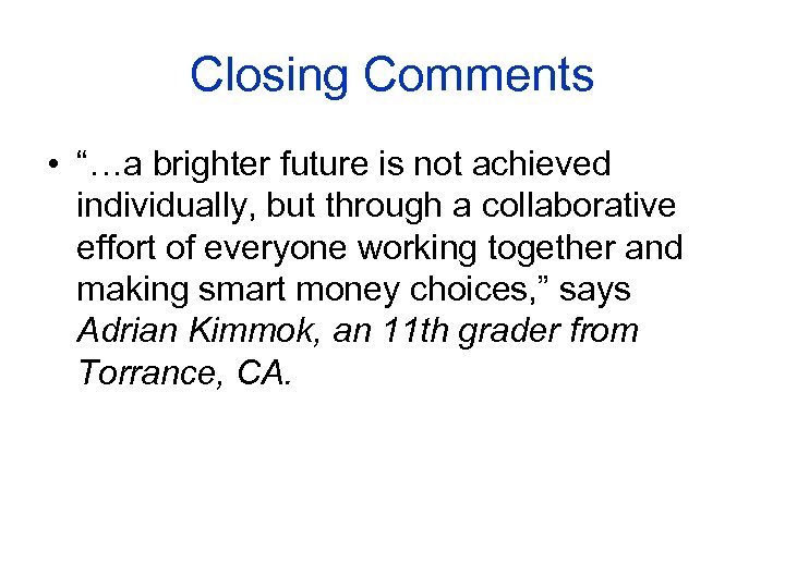 Closing Comments • “…a brighter future is not achieved individually, but through a collaborative effort of everyone working together and making smart money choices, ” says Adrian Kimmok, an 11 th grader from Torrance, CA.