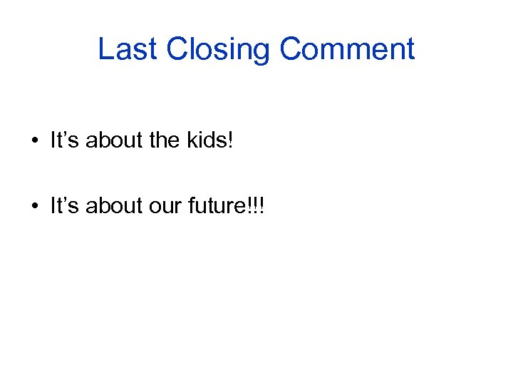 Last Closing Comment • It’s about the kids! • It’s about our future!!!