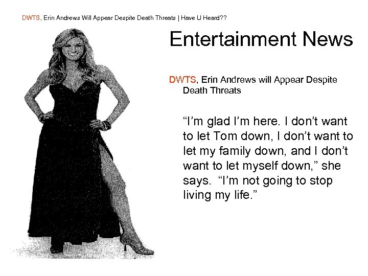 DWTS, Erin Andrews Will Appear Despite Death Threats | Have U Heard? ? Entertainment News DWTS, Erin Andrews will Appear Despite Death Threats “I’m glad I’m here. I don’t want to let Tom down, I don’t want to let my family down, and I don’t want to let myself down, ” she says. “I’m not going to stop living my life. ”