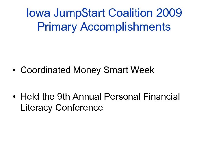 Iowa Jump$tart Coalition 2009 Primary Accomplishments • Coordinated Money Smart Week • Held the 9 th Annual Personal Financial Literacy Conference