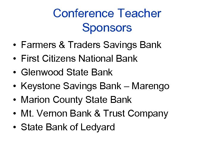 Conference Teacher Sponsors • • Farmers & Traders Savings Bank First Citizens National Bank Glenwood State Bank Keystone Savings Bank – Marengo Marion County State Bank Mt. Vernon Bank & Trust Company State Bank of Ledyard