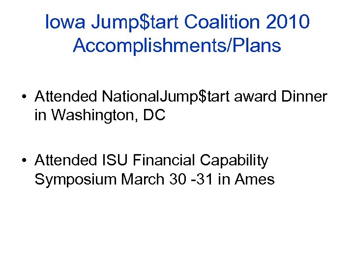 Iowa Jump$tart Coalition 2010 Accomplishments/Plans • Attended National. Jump$tart award Dinner in Washington, DC • Attended ISU Financial Capability Symposium March 30 -31 in Ames