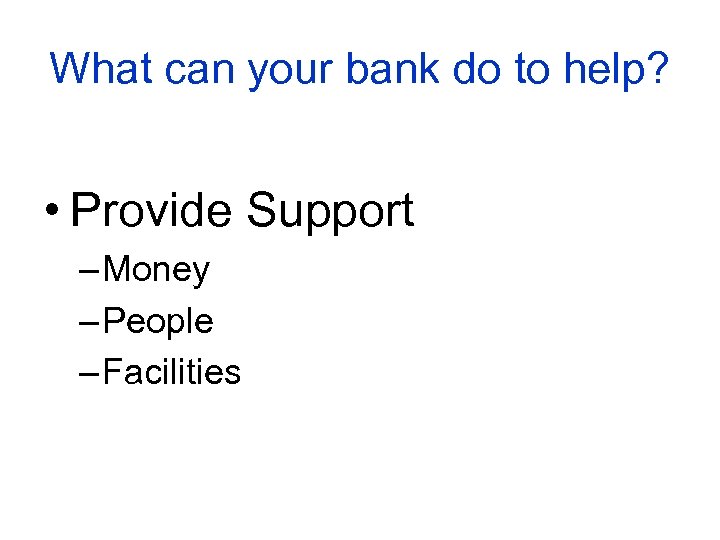 What can your bank do to help? • Provide Support – Money – People – Facilities