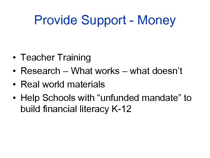 Provide Support - Money • • Teacher Training Research – What works – what doesn’t Real world materials Help Schools with “unfunded mandate” to build financial literacy K-12