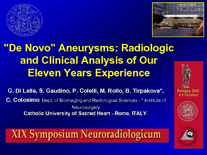 "De Novo" Aneurysms: Radiologic and Clinical Analysis of Our Eleven Years Experience G. Di Lella, S. Gaudino, P. Colelli, M. Rollo, B. Tirpakova*, C. Colosimo Dept. of Bioimaging and Radiological Sciences - * Institute of Neurosurgery Catholic University of Sacred Heart - Rome, ITALY.