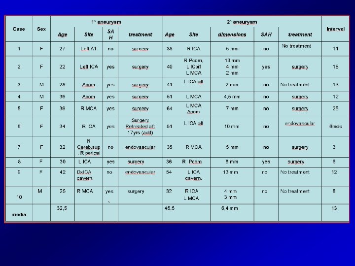 RESULTS - 1 • Ten patients ( 7 F, 3 M, mean age 44. 1 years) developed 13 de novo lesions with an average interval of 13 years. • All but one of the patients were under 40 years of age at the diagnosis of the first aneurysm. • Four patients were smokers, while three had hypertension. • Only one patient, a young female, had a familiar history of brain aneurysm, while another female and a young male developed multiple lesions. • Two patients, both with SAH at the time of first diagnosis, had new haemorrhage. In one case a de novo aneurysm occurred less than one year after the first treatment. • Regarding the site all but one of the lesions were in the anterior circulation, ICA and MCA being the most frequent locations.