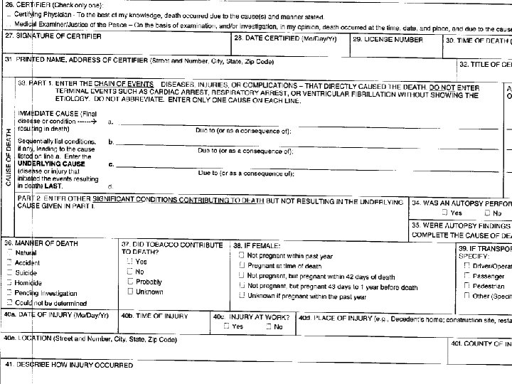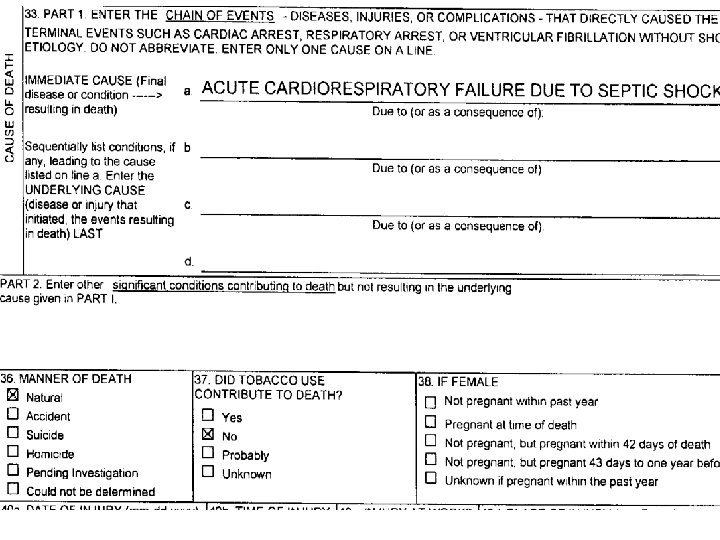 FETAL DEATH CERTIFICATE l MOST FETAL DEATHS ARE OF UNKNOWN ETIOLOGY, BUT THESE ARE PRESUMED TO BE “NATURAL”, AND OF NO M. E. INTEREST l NO MANNER OF DEATH IN FETAL DEATH l FACTORS CONTRIBUTING TO THE DEATH: LARGE NUMBER OF FIELDS TO FILL OUT