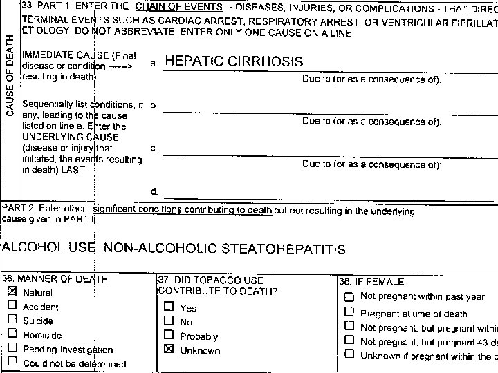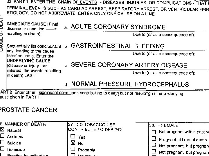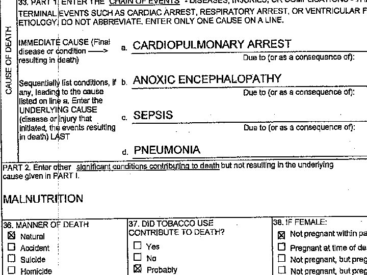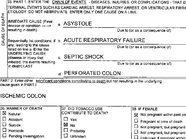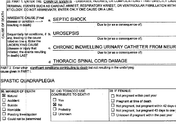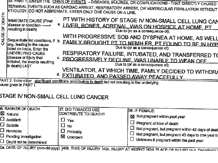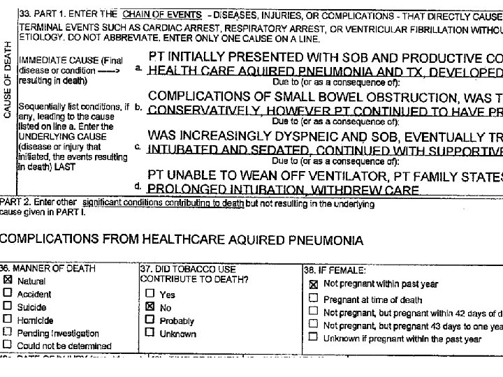 THIS ISN’T A CAUSE OF DEATH STATEMENT IT’S MORE LIKE A MEDICAL RECORD l ALMOST NONE OF THIS BELONGS ON A D. C. l CAUSE OF DEATH SHOULD SIMPLY READ “PNEUMONIA” l l PROBABLY NEEDS A “DUE TO…” COULD ADD “HOSPITAL ACQUIRED” DOES EVERYONE KNOW WHAT S. O. B. MEANS?