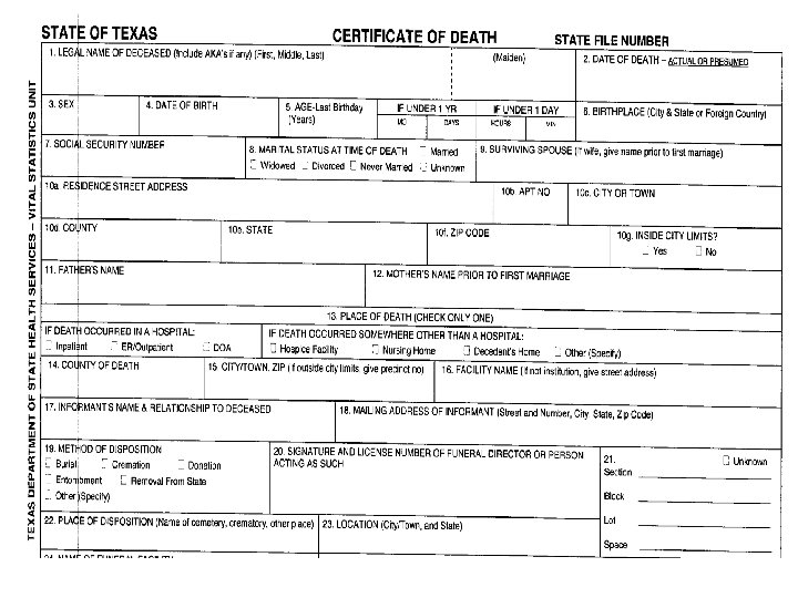 WHO USES D. C. ’s? l l l FAMILIES FUNERAL DIRECTORS INSURANCE COMPANIES LEGAL SYSTEM (THOUGH D. C. USUALLY NOT THEIR PRIMARY INTEREST) l INCLUDES POLICE, D. A. ’S, J. P. ’S l ESTATES AND TRUSTS EPIDEMIOLOGISTS AND STATISTICIANS