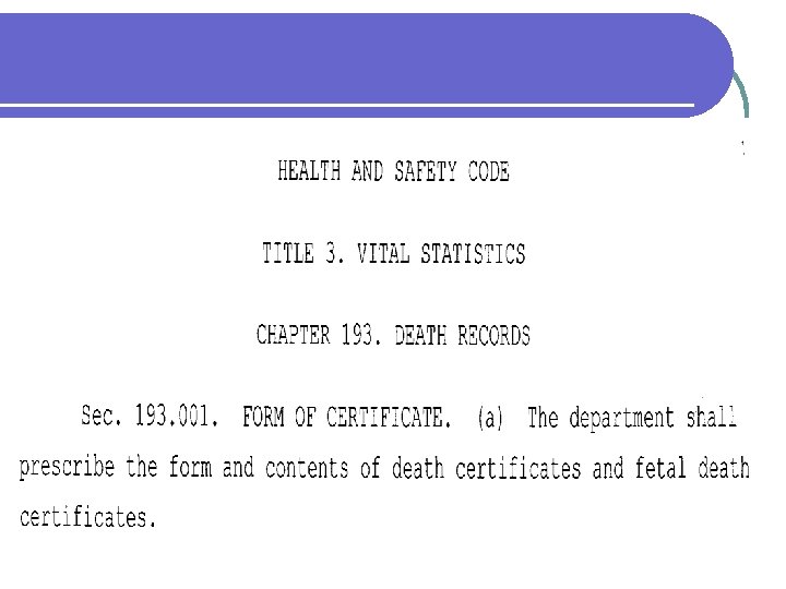 THIS TALK IS…… A GENERAL DISCUSSION OF DEATH CERTIFICATION…. l FROM THE PERSPECTIVE OF A MEDICAL EXAMINER, NOT THE VITAL RECORDS UNIT OR AN EPIDEMIOLOGIST l WILL PRIMARILY TALK ABOUT CAUSE AND MANNER OF DEATH STATEMENTS IN NATURAL DEATHS, SINCE MOST PROBLEMS ARISE THERE l PLEASE ASK QUESTIONS (BUT NOT ABOUT TER!) l
