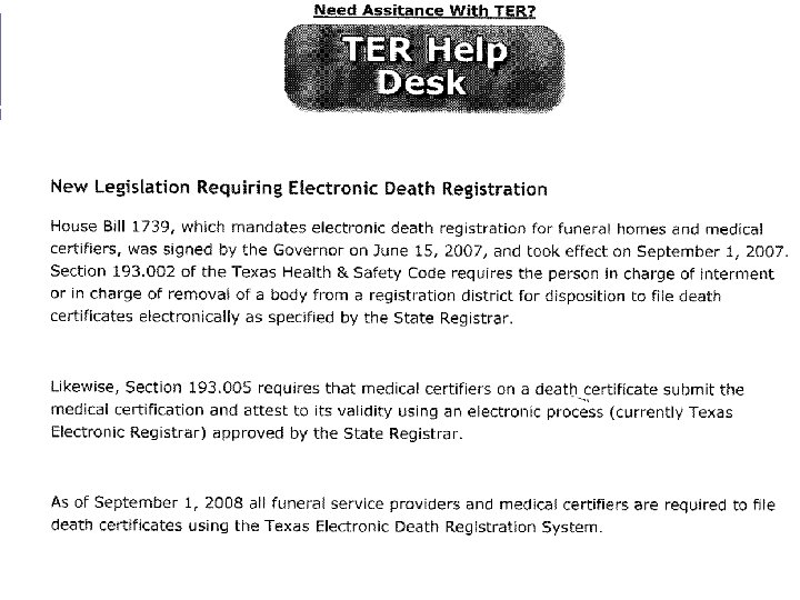 ONLINE D. C. ’S NOW REQUIRED IN TEXAS; ANY PHYSICIAN WHO MIGHT EVER NEED TO SIGN A D. C. MUST REGISTER l WEB-BASED, ACCESSIBLE ANYWHERE l TEXAS MEDICAL BOARD WILL FINE PHYSICIANS WHO SIGN A PAPER D. C. INSTEAD OF USING THE ONLINE SYSTEM l SO…. SOME DOCTORS REFUSE TO SIGN SINCE THEY ARE NOT REGISTERED IN THE ONLINE SYSTEM, BUT THIS WILL LIKELY ALSO RESULT IN BOARD ACTION l