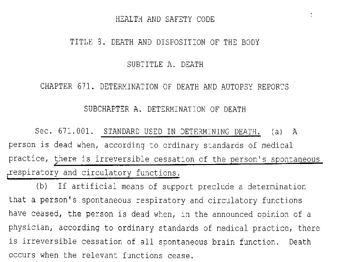 WHAT IS DEATH? l TEXAS HEALTH AND SAFETY CODE CHAPTER 671 l “IRREVERSIBLE CESSATION OF THE PERSON’S SPONTANEOUS RESPIRATORY AND CIRCULATORY FUNCTIONS” l l IN OTHER WORDS “CARDIOPULMONARY ARREST” OR “IRREVERSIBLE CESSATION OF ALL SPONTANEOUS BRAIN FUNCTIONS”