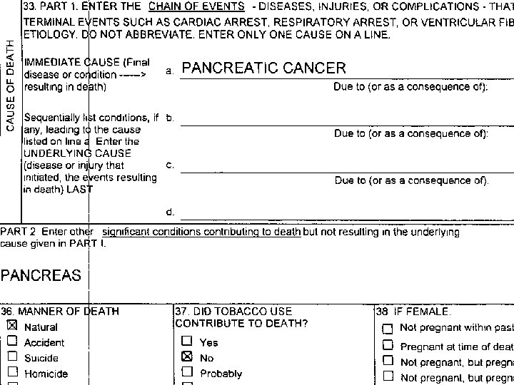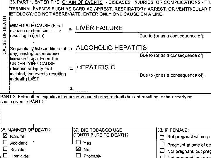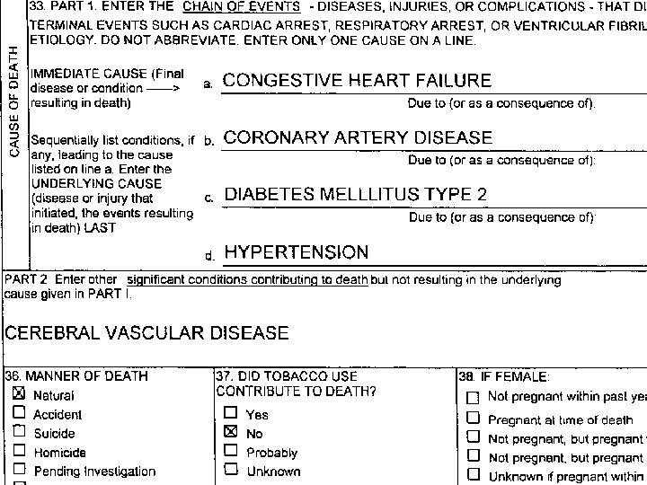 THE CURRENT D. C. l GREAT FOR DOCUMENTING THAT DEATH OCCURRED AT A PARTICULAR TIME AND PLACE l USEFULNESS AS A TOOL FOR COLLECTING CAUSE AND MANNER OF DEATH DATA ENTIRELY DEPENDENT ON HOW WELL BLOCK 33. IS FILLED OUT