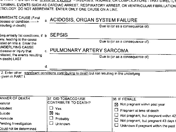 GOOD D. C. BUT IT WOULD BE BETTER TO JUST SAY “PULMONARY ARTERY SARCOMA” l EVERYTHING ELSE IS PART OF THE MECHANISM OF DEATH, AND ADDS NOTHING TO THE DEATH CERTIFICATION l