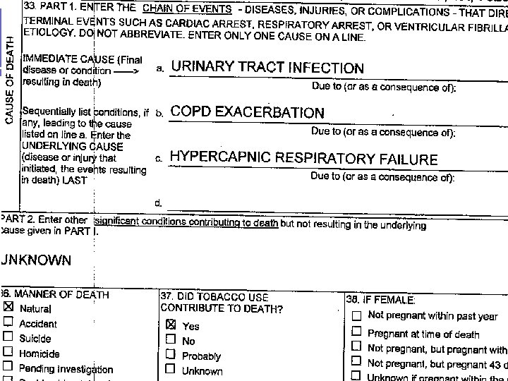 Hmmmm…. SO RESPIRATORY FAILURE CAUSED THE COPD AND UTI? ? ? l BY THE WAY…SHOULD NEVER USE ABBREVIATIONS ON DEATH CERTIFICATES l AND NEVER PUT “UNKNOWN” ON A D. C. UNLESS YOU ARE A M. E. OR J. P. WITH A FULL INVESTIGATION TO WORK WITH l