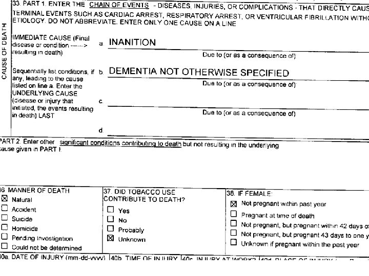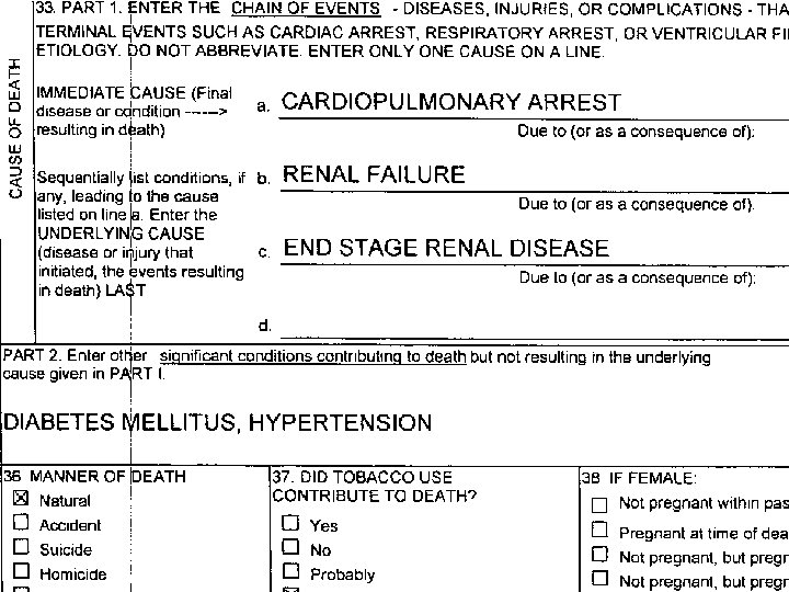 CAUSE OF DEATH THAT DISEASE, CONDITION, INJURY OR THING BUT FOR WHICH DEATH WOULD NOT HAVE OCCURRED l DON’T CONFUSE WITH MECHANISM OF DEATH l l l HYPOXIA RENAL FAILURE ELECTROLYE PROBLEMS ASPIRATION…. THESE ARE NOT CAUSES