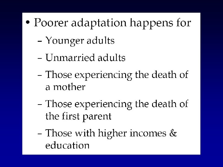 Late Adulthood- Older adults • Least concerned with dying Loss of a partner Loss of child or grandchild **although think about death more In recent survey (AARP) -2, 000 Americans age 45 and older were questioned about their fear of dying. 30% of those 45 -49 expressed fear of dying 15 of those 75 and older expressed fear of dying More women overall (24%) than men overall (18% ) were afraid of dying
