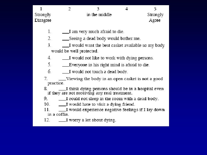 Fantasy Death Exercise • What are your criteria for a ‘good’ death? • The only hitch, as in life, is that you have to die. • Imagine you are there right now • Notice where you are, what your are doing, who is with you, what it is like, perhaps sounds, smells, other sensory specifics…