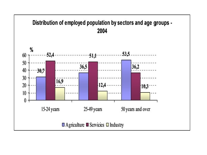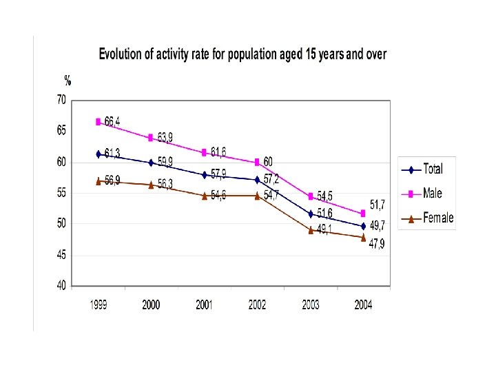 Statistical indicators of decent work I Employment opportunities 1 Labour force participation rate 2 Employment-population ratio 3 Unemployment rate 4 Youth unemployment rate 5 Share of wage employment in non-agricultural employment II Unacceptable work 6 Children in wage employment or self-employment activity rate 7 Children not in school by employment status III Adequate earnings and productive work 8 Inadequate pay rate 9 Average earnings in selected occupations 10 IV Employees with recent job training Decent hours 11 Excessive hours of work 12 Time-related underemployment rate V Stability and security of work 13 Tenure less then one year 14 Temporary work VI 15 Balancing work and family life Employment rate for women with children under compulsory age
