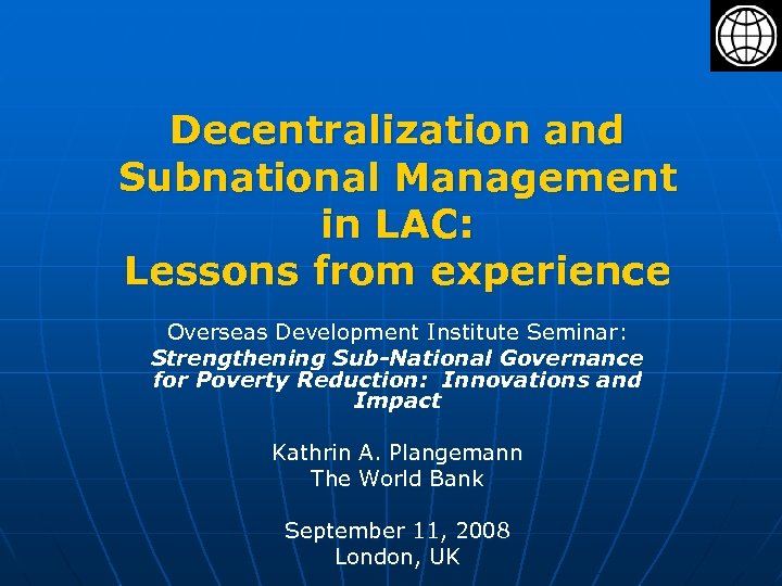 Decentralization and Subnational Management in LAC: Lessons from experience Overseas Development Institute Seminar: Strengthening Sub-National Governance for Poverty Reduction: Innovations and Impact Kathrin A. Plangemann The World Bank September 11, 2008 London, UK