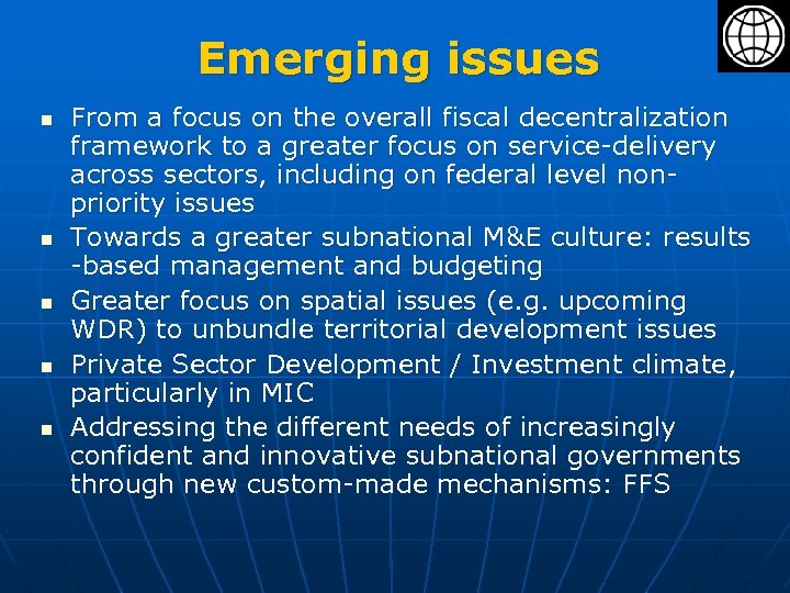 Emerging issues n n n From a focus on the overall fiscal decentralization framework to a greater focus on service-delivery across sectors, including on federal level nonpriority issues Towards a greater subnational M&E culture: results -based management and budgeting Greater focus on spatial issues (e. g. upcoming WDR) to unbundle territorial development issues Private Sector Development / Investment climate, particularly in MIC Addressing the different needs of increasingly confident and innovative subnational governments through new custom-made mechanisms: FFS