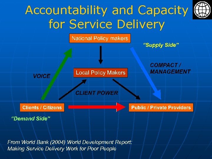 Accountability and Capacity for Service Delivery “Supply Side” “Demand Side” From World Bank (2004) World Development Report: Making Service Delivery Work for Poor People