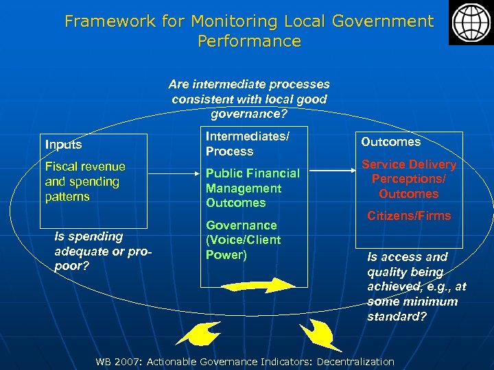 Framework for Monitoring Local Government Performance Are intermediate processes consistent with local good governance? Intermediates/ Process Inputs Fiscal revenue and spending patterns Is spending adequate or propoor? Public Financial Management Outcomes Governance (Voice/Client Power) Outcomes Service Delivery Perceptions/ Outcomes Citizens/Firms Is access and quality being achieved, e. g. , at some minimum standard? WB 2007: Actionable Governance Indicators: Decentralization