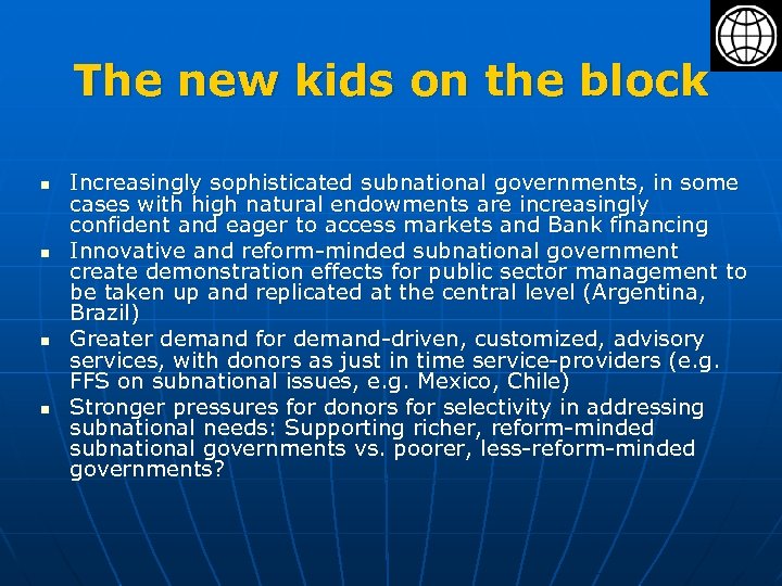 The new kids on the block n n Increasingly sophisticated subnational governments, in some cases with high natural endowments are increasingly confident and eager to access markets and Bank financing Innovative and reform-minded subnational government create demonstration effects for public sector management to be taken up and replicated at the central level (Argentina, Brazil) Greater demand for demand-driven, customized, advisory services, with donors as just in time service-providers (e. g. FFS on subnational issues, e. g. Mexico, Chile) Stronger pressures for donors for selectivity in addressing subnational needs: Supporting richer, reform-minded subnational governments vs. poorer, less-reform-minded governments?
