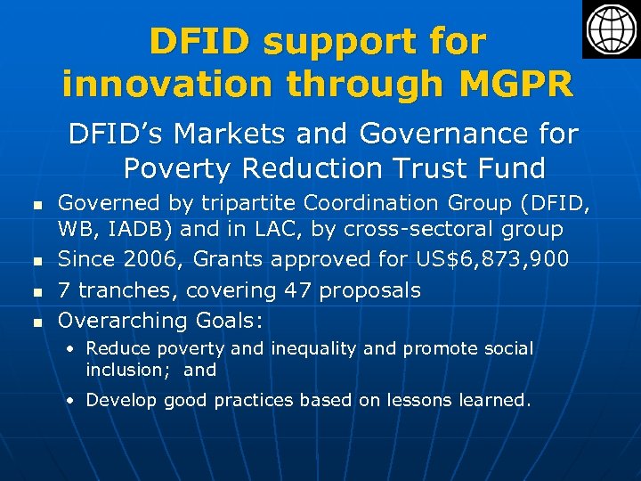 DFID support for innovation through MGPR DFID’s Markets and Governance for Poverty Reduction Trust Fund n n Governed by tripartite Coordination Group (DFID, WB, IADB) and in LAC, by cross-sectoral group Since 2006, Grants approved for US$6, 873, 900 7 tranches, covering 47 proposals Overarching Goals: • Reduce poverty and inequality and promote social inclusion; and • Develop good practices based on lessons learned.