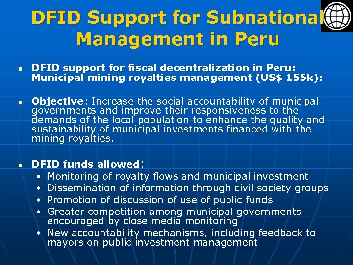 DFID Support for Subnational Management in Peru n n n DFID support for fiscal decentralization in Peru: Municipal mining royalties management (US$ 155 k): Objective: Increase the social accountability of municipal governments and improve their responsiveness to the demands of the local population to enhance the quality and sustainability of municipal investments financed with the mining royalties. DFID funds allowed: • Monitoring of royalty flows and municipal investment • Dissemination of information through civil society groups • Promotion of discussion of use of public funds • Greater competition among municipal governments encouraged by close media monitoring • New accountability mechanisms, including feedback to mayors on public investment management