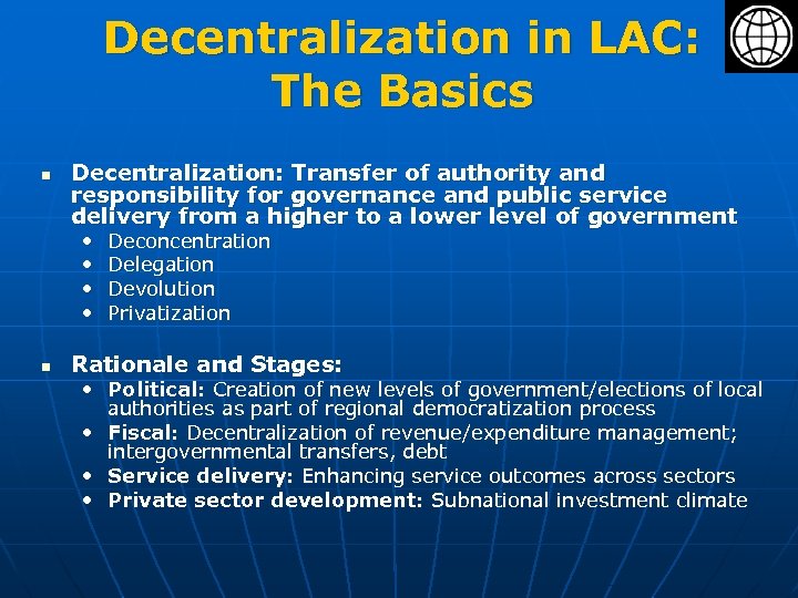 Decentralization in LAC: The Basics n Decentralization: Transfer of authority and responsibility for governance and public service delivery from a higher to a lower level of government • • n Deconcentration Delegation Devolution Privatization Rationale and Stages: • Political: Creation of new levels of government/elections of local authorities as part of regional democratization process • Fiscal: Decentralization of revenue/expenditure management; intergovernmental transfers, debt • Service delivery: Enhancing service outcomes across sectors • Private sector development: Subnational investment climate