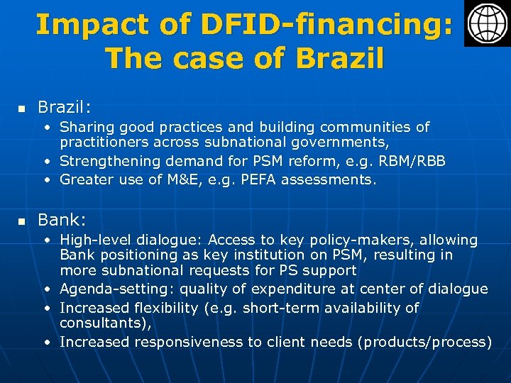 Impact of DFID-financing: The case of Brazil n Brazil: • Sharing good practices and building communities of practitioners across subnational governments, • Strengthening demand for PSM reform, e. g. RBM/RBB • Greater use of M&E, e. g. PEFA assessments. n Bank: • High-level dialogue: Access to key policy-makers, allowing Bank positioning as key institution on PSM, resulting in more subnational requests for PS support • Agenda-setting: quality of expenditure at center of dialogue • Increased flexibility (e. g. short-term availability of consultants), • Increased responsiveness to client needs (products/process)