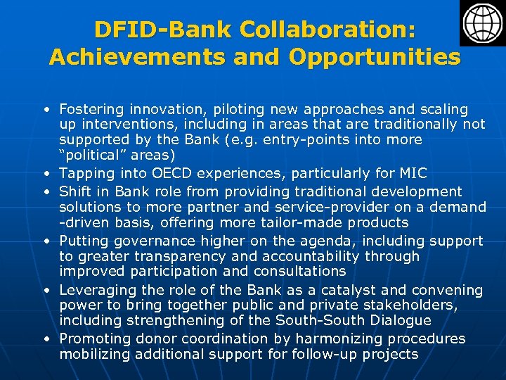 DFID-Bank Collaboration: Achievements and Opportunities • Fostering innovation, piloting new approaches and scaling up interventions, including in areas that are traditionally not supported by the Bank (e. g. entry-points into more “political” areas) • Tapping into OECD experiences, particularly for MIC • Shift in Bank role from providing traditional development solutions to more partner and service-provider on a demand -driven basis, offering more tailor-made products • Putting governance higher on the agenda, including support to greater transparency and accountability through improved participation and consultations • Leveraging the role of the Bank as a catalyst and convening power to bring together public and private stakeholders, including strengthening of the South-South Dialogue • Promoting donor coordination by harmonizing procedures mobilizing additional support for follow-up projects