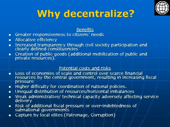 Why decentralize? n n n n n Benefits Greater responsiveness to citizens’ needs Allocative efficiency Increased transparency through civil society participation and clearly defined constituencies Creation of public goods (additional mobilization of public and private resources). Potential costs and risks Loss of economies of scale and control over scarce financial resources by the central government, resulting in increasing fiscal pressure Higher difficulty for coordination of national policies. Unequal distribution of resources/horizontal imbalances Weak administrative/ technical capacity adversely affecting service delivery Risk of additional fiscal pressure or over-indebtedness of subnational governments Capture by local elites (Patronage, Corruption)